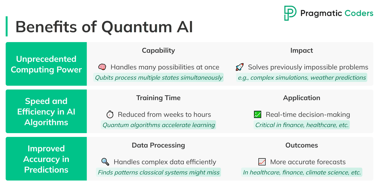 Quantum AI also promises better accuracy. Classical AI systems are powerful but can struggle with very complex data. Quantum AI, on the other hand, can process large amounts of information at once, finding patterns that classical systems might miss. This could lead to more accurate forecasts, whether in healthcare, finance, or climate science. Early research suggests that quantum AI will outperform today’s systems in making predictions.